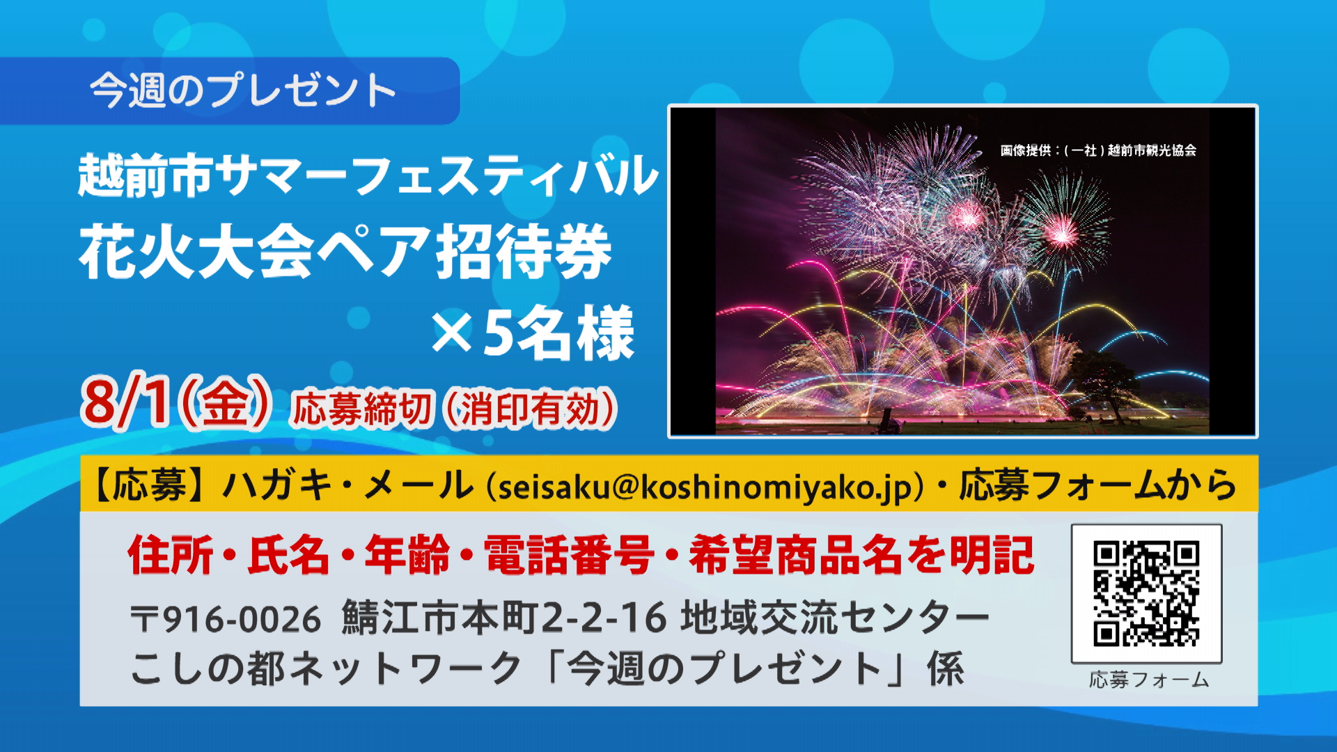 2.越前市サマーフェスティバル花火大会 ペア招待券×5名様:応募締切:8月1日(金)