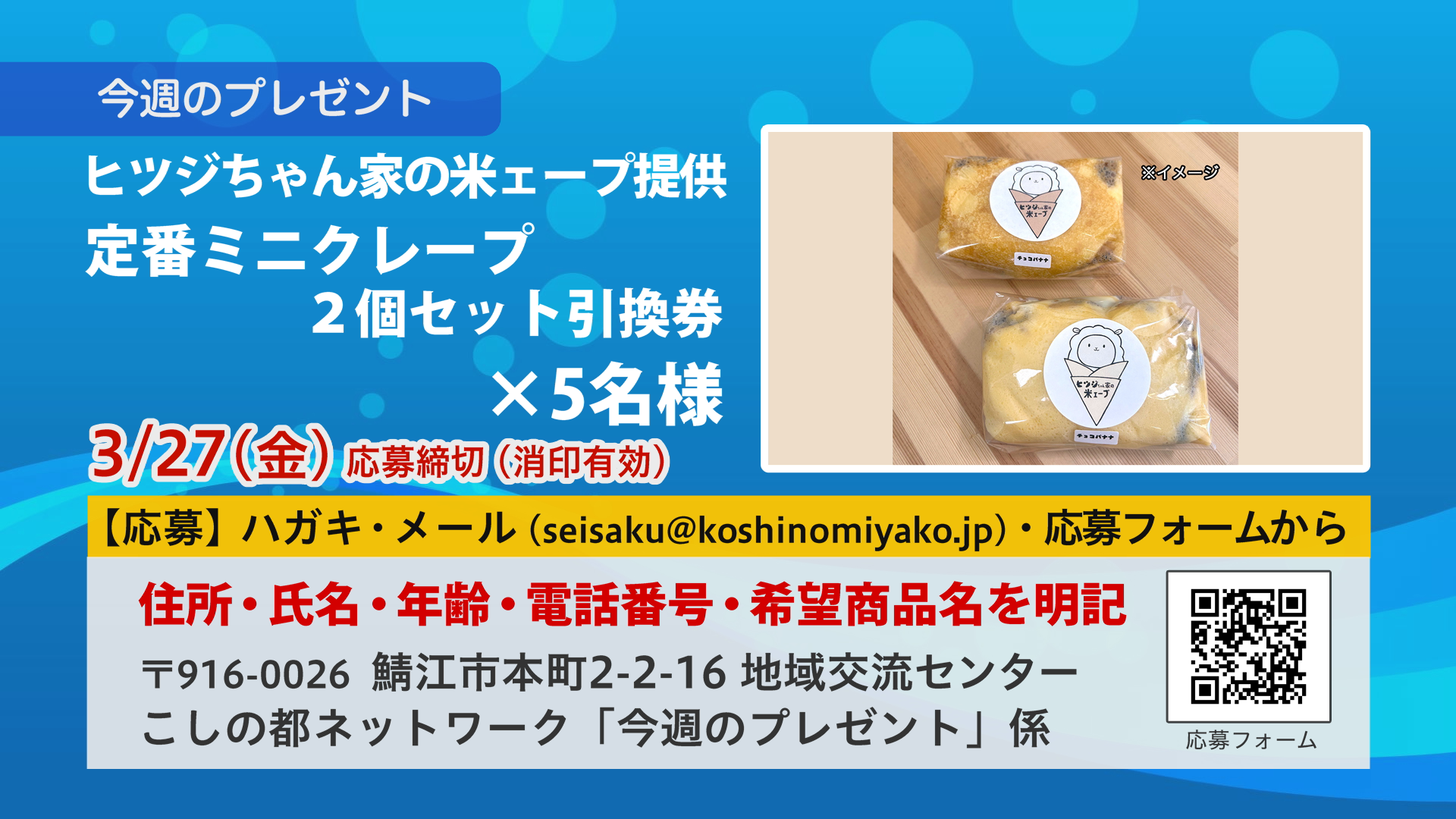 1.ヒツジちゃん家の米ェープ提供_定番ミニクレープ2個セット引換券×5名様:応募締切:3月27日(金)