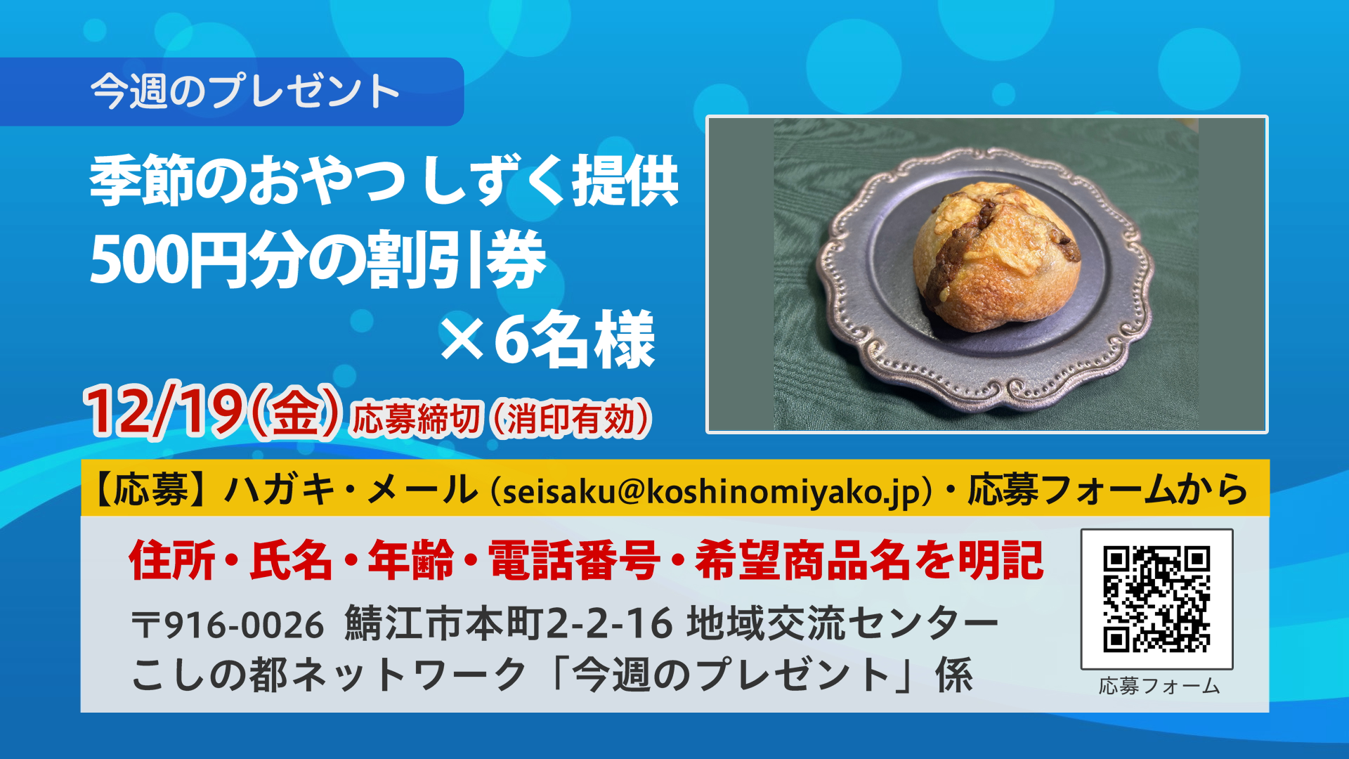 1.季節のおやつしずく提供_500円分の割引券×6名様:応募締切:12月19日(金)