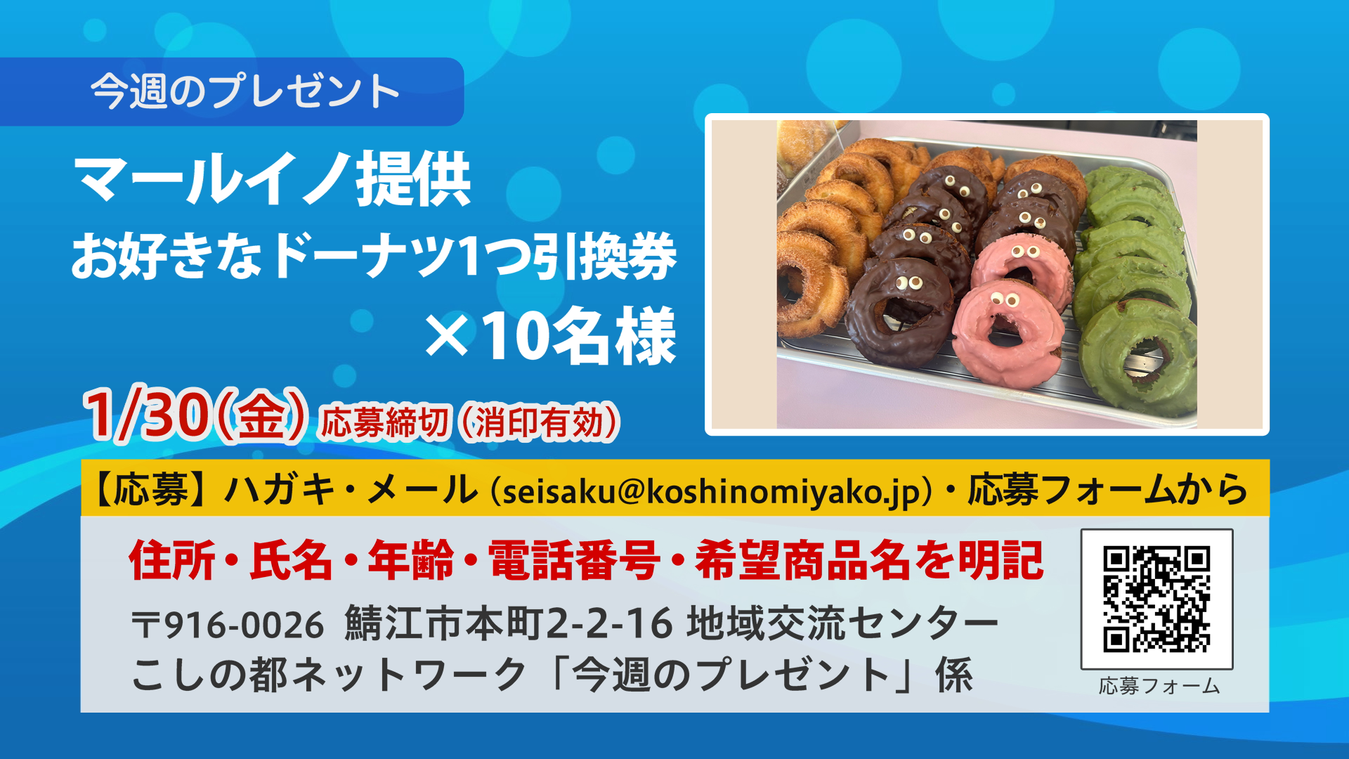 1.マールイノ提供_お好きなドーナツ1つ引換券×10名様:応募締切:1月30日(金)