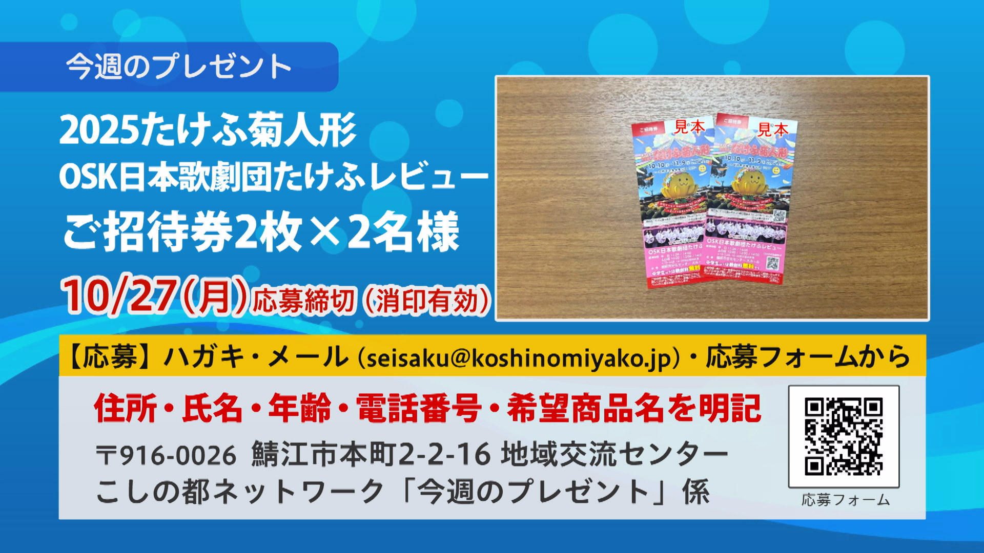 3.OSK日本歌劇団たけふレビューご招待券2枚×2名様:応募締切:10月27日(月)