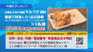 1.元祖からあげ本舗マルフク提供_番組で試食した1品 引換券×5名様:応募締切:8月15日(金)